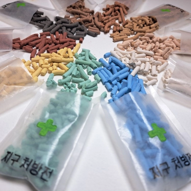 지구처방전 물감은 버려져서 환경을 오염시키는 굴패각과 뿔소라를 활용하여 만든 친환경 물감입니다. 돌, 나무, 종이 어디든 자유롭게 색을 칠할 수 있으며 나뭇가지, 풀잎 등을 활용하여 자연미술 창작활동을 할 수 있습니다. 특히 종이액자와 풀을 사용하면 실내외에서 다양한 평면, 입체 창작 표현 활동이 가능합니다.