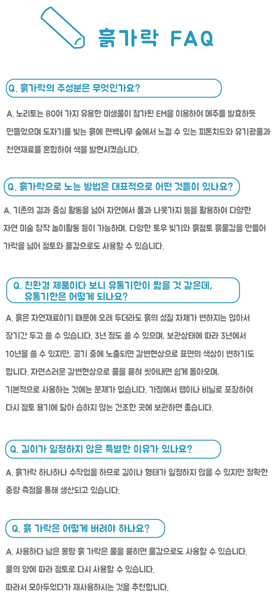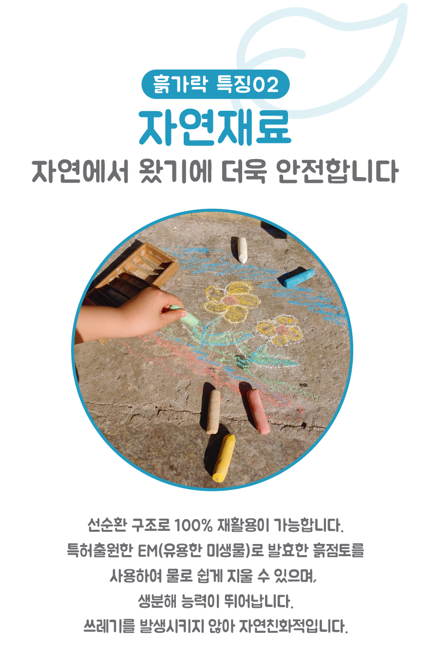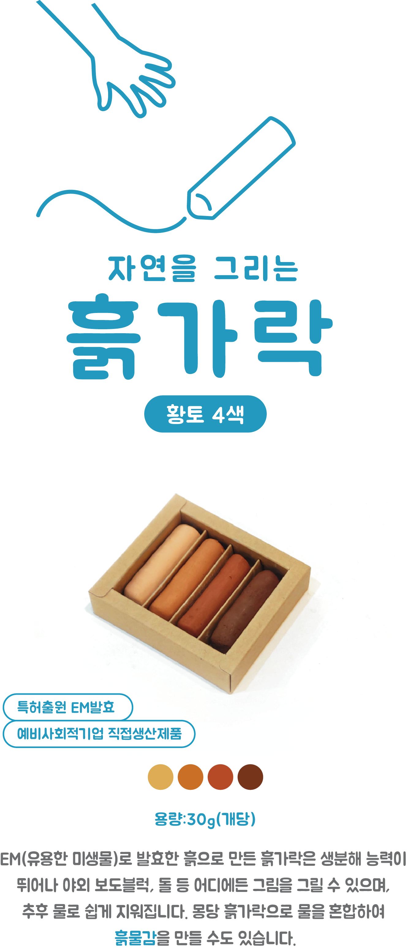 EM(유용한 미생물)으로 발효한 흙으로 만든 흙 가락은 생분해 능력이 뛰어나 야외 보도블록, 돌 등 어디에든 그림을 그릴 수 있으며, 추후 물로 쉽게 지워 집니다. 그 외 몽당 흙 가락은 물과 혼합하여 흙물감을 만들 수도 있습니다.