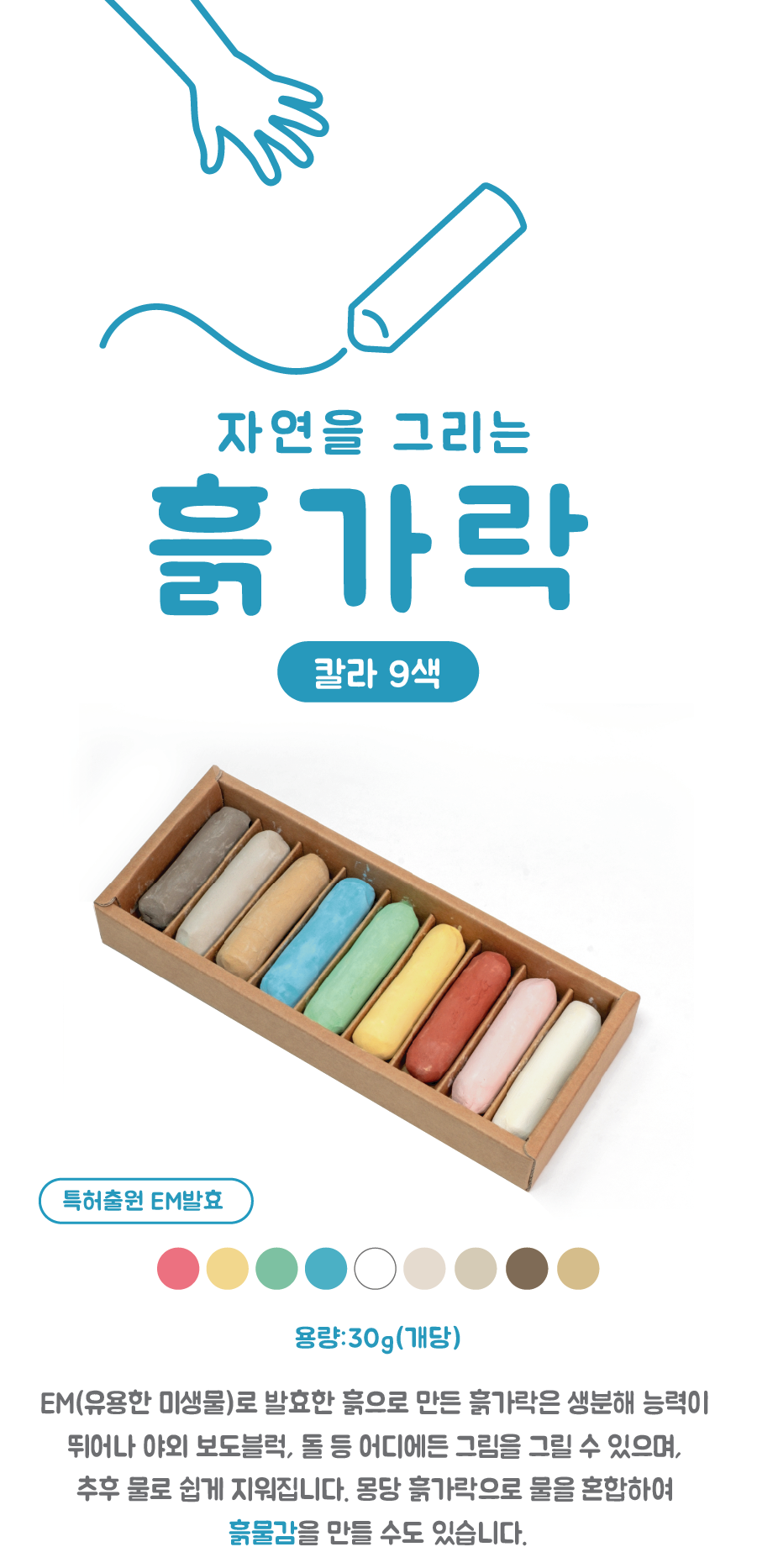 EM(유용한 미생물)으로 발효한 흙으로 만든 흙 가락은 생분해 능력이 뛰어나 야외 보도블록, 돌 등 어디에든 그림을 그릴 수 있으며, 추후 물로 쉽게 지워 집니다. 그 외 몽당 흙 가락은 물과 혼합하여 흙물감을 만들 수도 있습니다.