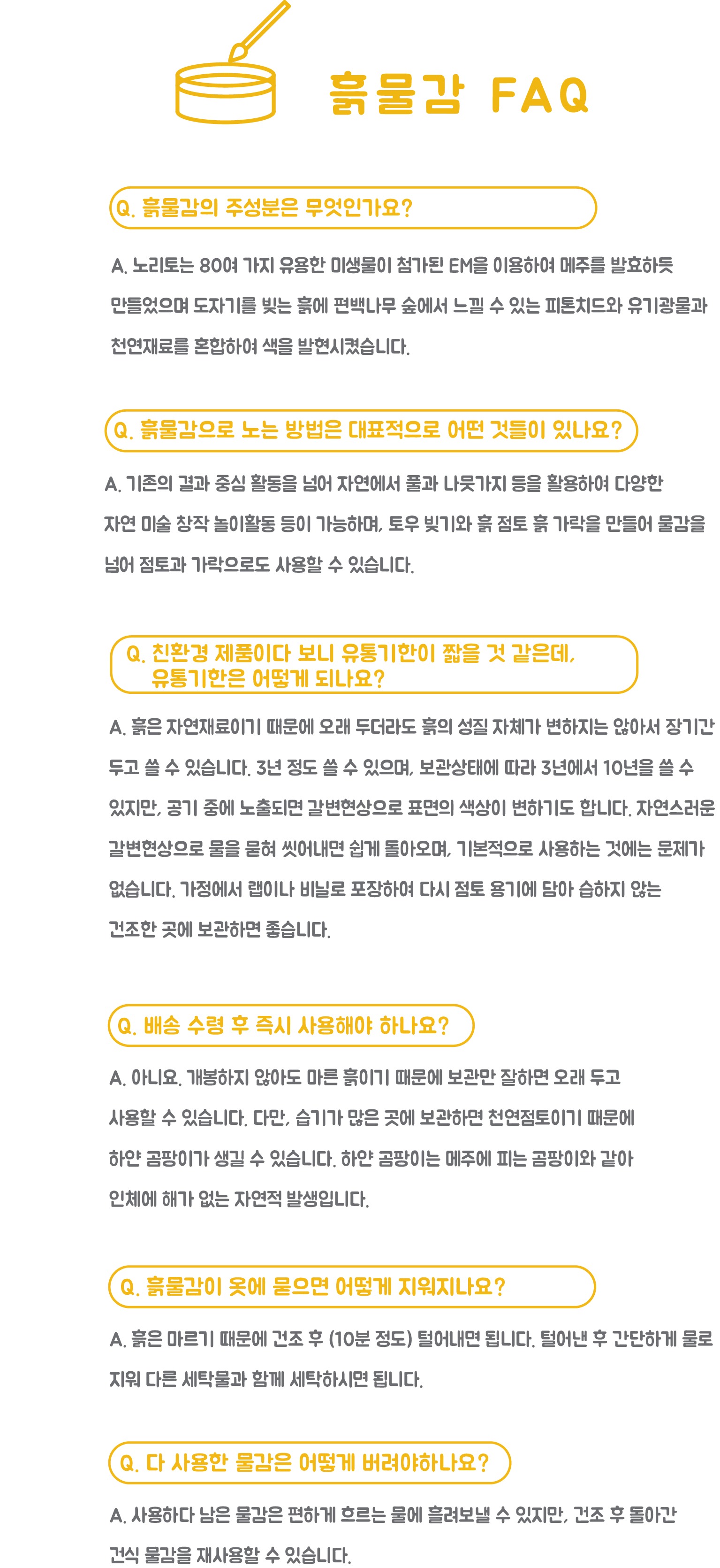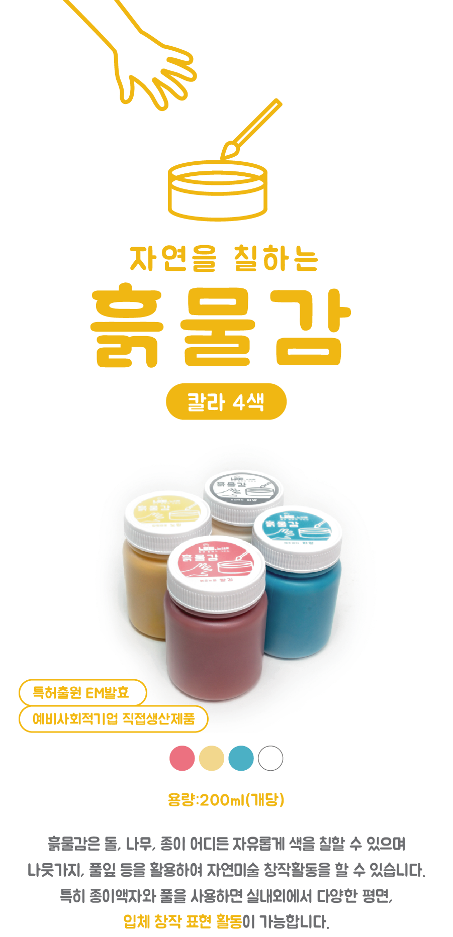 흙 물감은 돌, 나무, 종이 어디든 자유롭게 색을 칠할 수 있으며 나뭇가지, 풀잎 등을 활용하여 자연 미술 창작활동을 할 수 있습니다. 특히 종이 액자와 풀을 사용하면 실내외에서 다양한 평면, 입체 창작 표현 활동이 가능합니다.