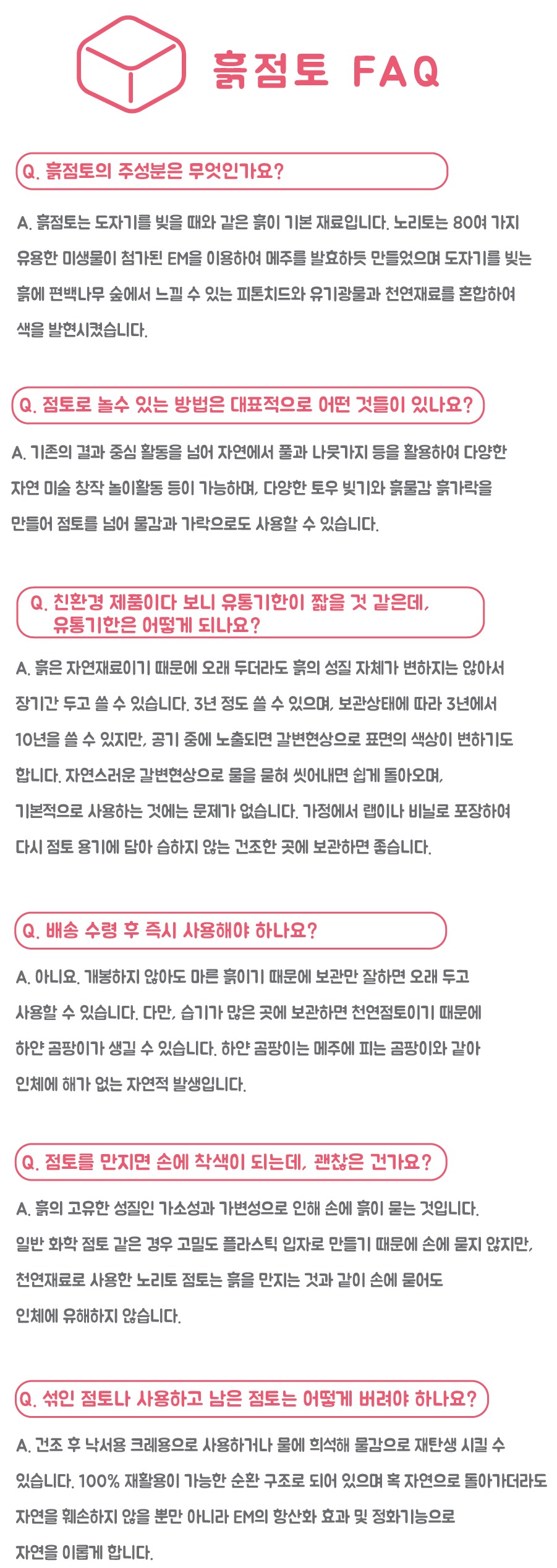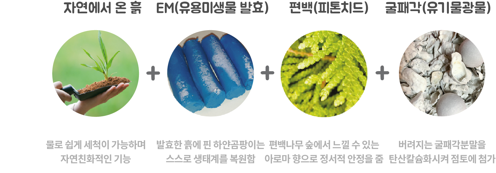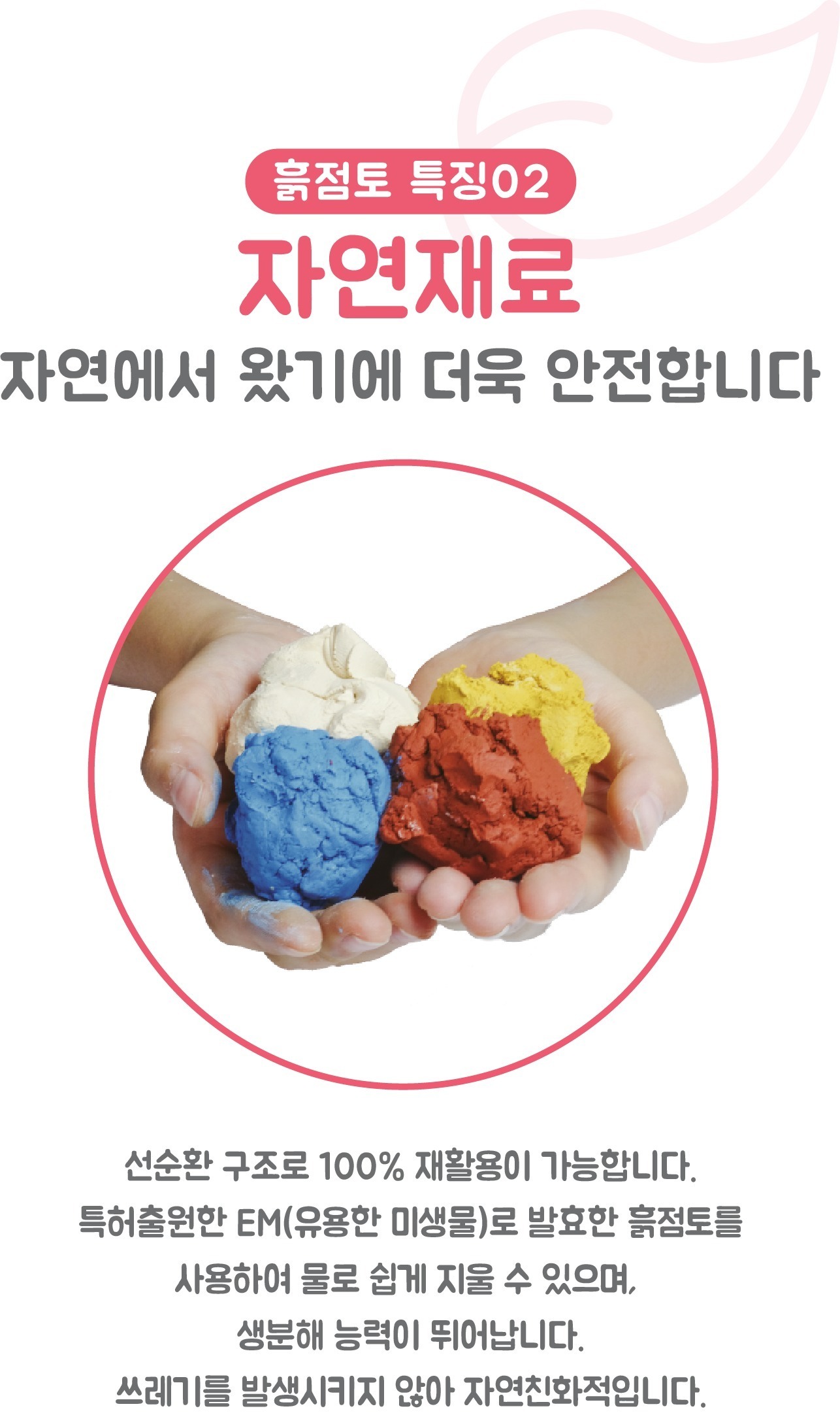 흙 점토는 다양한 토우 빚기와 촉감 놀이에 적합하며 흙 가락과 흙 물감을 만들어 볼 수도 있습니다. 특히 황토는 생분해와 정화능력이 뛰어나 야외에서 풀과 나뭇가지 등을 활용하여 다양한 자연 미술 활동을 할 수 있습니다.