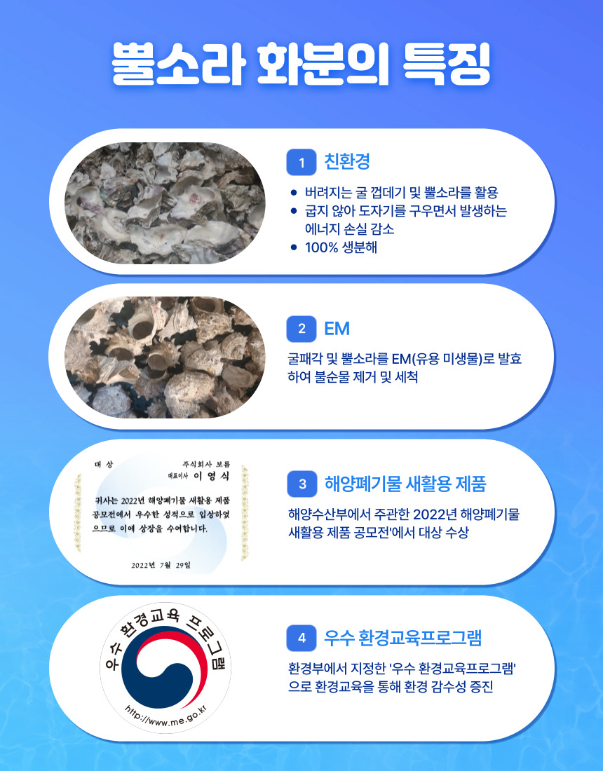 뿔소라 바다소리 ECO화분 키트는 버려져서 환경을 오염시키는 굴패각과 뿔소라를 활용한 친환경 화분을 만들 수 있는 키트입니다. 항균 99.9% · 탈취 68.8 ~ 89.5% 기능을 포함하고 있습니다. 뿔소라의 원형을 그대로 살렸으며 뿔소라 부분에는 식물을 심고 현무암 부분에는 아로마 오일을 떨어뜨려 아로마 스톤으로 사용할 수도 있습니다.